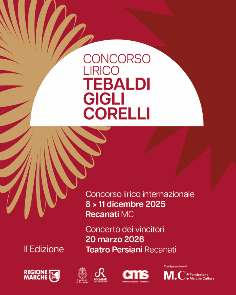 Il Concorso Lirico Internazionale “Tebaldi-Gigli-Corelli” è stato istituito dalla Regione Marche con decreto 448/2022 e si configura come un appuntamento di primo piano nel panorama musicale italiano. L’iniziativa è coordinata dal Consorzio Marche Spettacolo (CMS), che riunisce 44 soggetti attivi nello spettacolo dal vivo del territorio marchigiano, e si avvale del sostegno di Fondazione Marche Cultura, che con il suo patrocinio conferma l’impegno nella promozione dell’eccellenza culturale regionale.