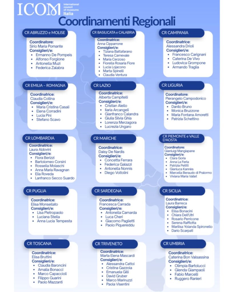 I Coordinamenti regionali ICOM, strumenti operativi del Comitato Nazionale, svolgono un ruolo cruciale nel radicare localmente la missione dell’organizzazione: favoriscono il confronto con istituzioni e comunità museali, promuovono networking con associazioni e realtà internazionali, trasformano le specificità territoriali in risorse condivise.