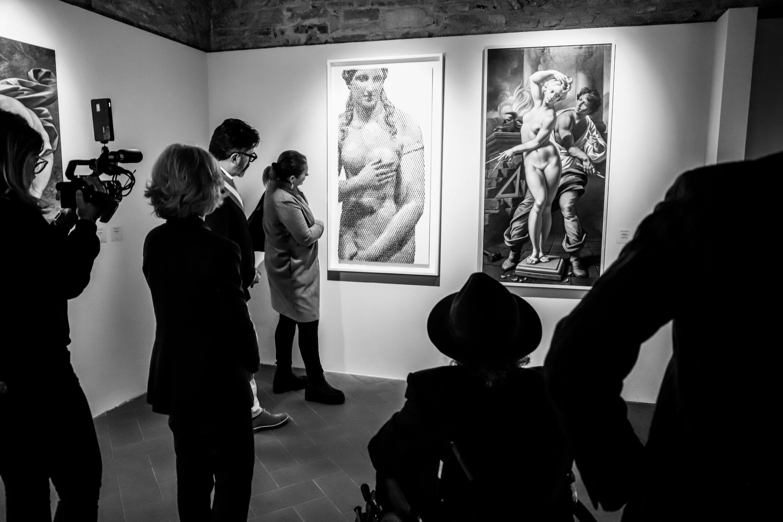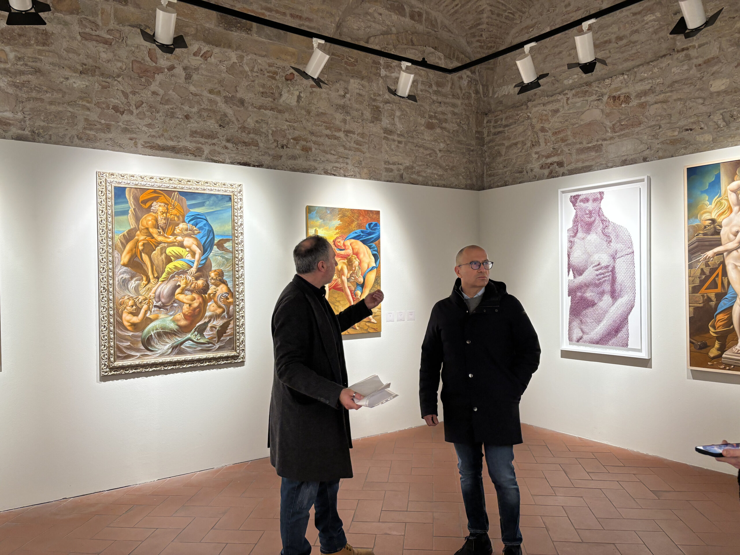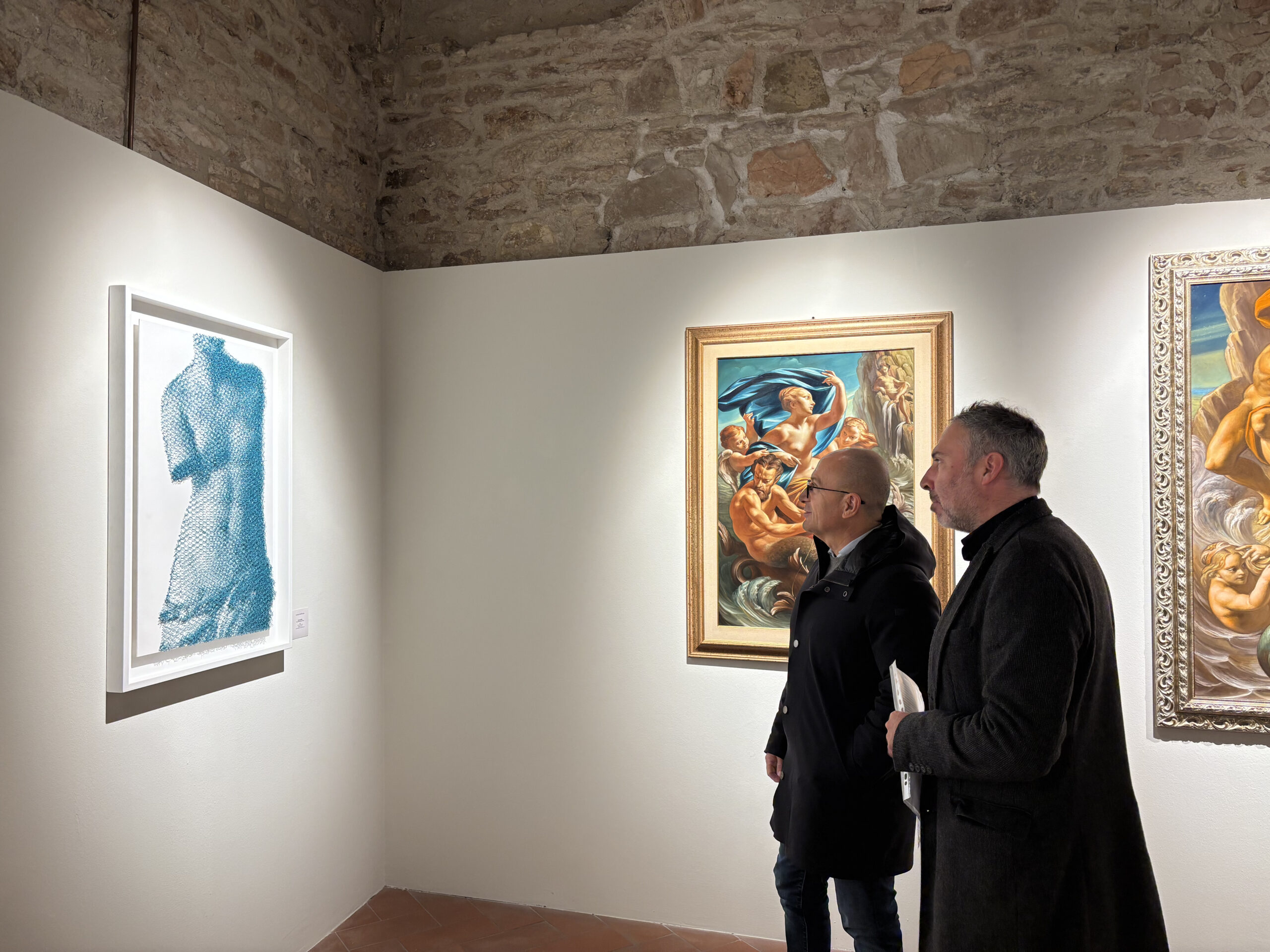 Cuore della mostra, allestita negli spazi di Palazzo degli Scalzi, è il tema del mito, esplorato attraverso il linguaggio neo-manierista di Bruno d’Arcevia e la ricerca visiva di Giorgio Tentolini, noto per le sue opere realizzate con stratificazioni di rete metallica. Il sottotitolo “La maniera del mito” richiama simbolicamente la figura di Pigmalione, emblema del rapporto tra creazione artistica e trasformazione.